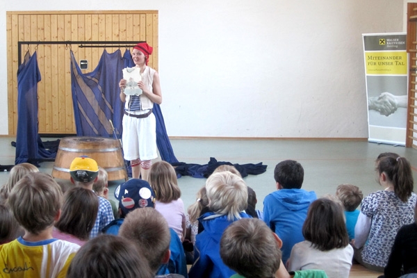Im Mai hieß es in der Mittelberger Sporthalle: "Piratenmolly Ahoi!" Mit dem Theaterstück unterhielt die Piratenmolly alias Olga Wäscher vom Vorarlberger Landestheater die Volksschüler des Tales Mit viel Sprachwitz, Musik und ein bisschen Lebensphilosophie. Die Theateraufführung wurde zur Gänze von der Walser Raiffeisen Holding finanziert. Schultheater "Piratenmolly" All diese Aktionen sind in unseren Augen sehr wertvolle Ergänzungen für die Schüler und bestätigen unsere Auffassung, dass Investitionen in Bildung jedenfalls gut angelegtes Geld ist.