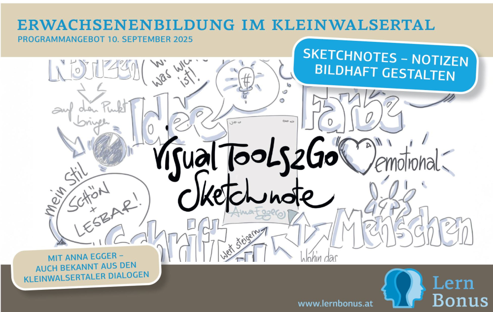 Sketchnotes sind visuelle Notizen, die mit einfachen Bildsymbolen, simplen Formen und handschriftlichen Vermerken komplexe Inhalte griffig auf den Punkt bringen. Wir lernen, mit Sketchnotes Wissen zu verankern. Mit etwas Übung kommt rasch Spaß am Tun.